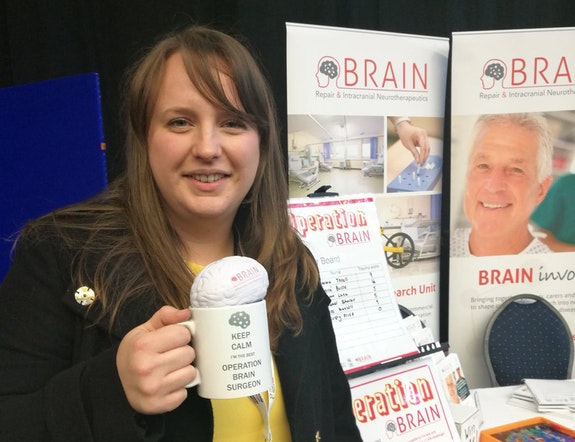 Mae enillydd Operation Brain, Kirsty, yn casglu ei mwg a’i gwobrau wedi’u teilwra yn stondin Uned BRAIN