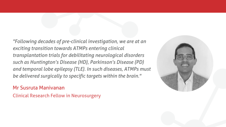 Yn dilyn degawdau o ymchwilio cyn-glinigol, rydym mewn cyfnod cyffrous o drawsnewid tuag at ATMPs yn mynd i mewn i dreialon trawsblannu clinigol ar gyfer anhwylderau niwrolegol gwanychol fel Clefyd Huntington (HD), Clefyd Parkinson (PD) ac epilepsi llabed arleisiol (TLE). Mewn clefydau o’r fath, rhaid i ATMPs gael eu cyflwyno’n llawfeddygol i dargedau penodol o fewn yr ymennydd.